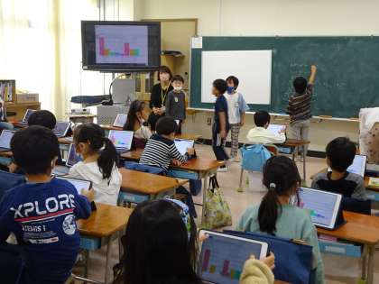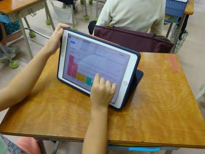 1年生の学級会で、子どもたちが司会をして、クラス遊びの相談をしました。何がやりたいかみんなの意見を聞き、ロイロノートのアンケート機能を使って集計しました。多い順に集計結果が示されて、人数の多かった遊びをすることに決まりました。