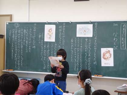 2年生の道徳です。なわとびがうまくできなくても、何度も練習をしてできるようになった登場人物の気持ちを通して、目標に向かって粘り強く取り組むことに大切さについて考えました。すすんで自分の考えを発表し合う子どもたちです。教材文のように、なわとびコンクールに向けて頑張る子どもたちです。
