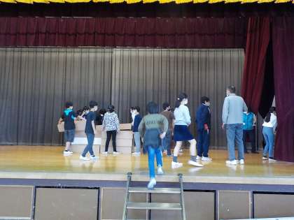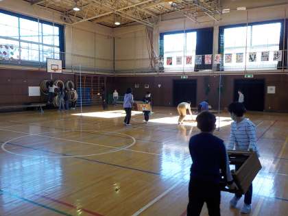 パネルや長机、図工室イスの移動、跳び箱や調整台、ボール、すのこを戻す。
