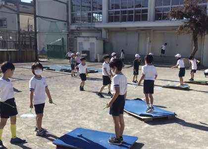 先週の生山ひじき先生の講習から、さらに意欲を高めて練習をしています。今日はなわとび検定だけでなく、ロイター板やジャンプ台を用い、高く跳ぶ、速く回すなどの練習を行いました。