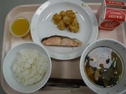 本日の献立 ごはん 牛乳 魚の塩焼き じゃがいもの甘辛煮 根菜汁 みかんゼリー