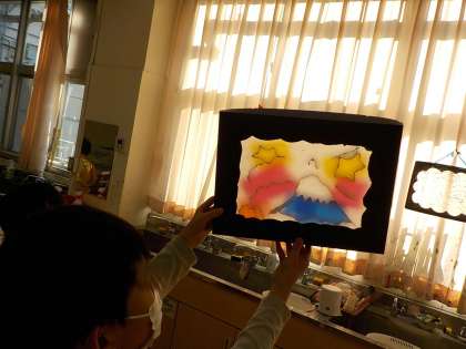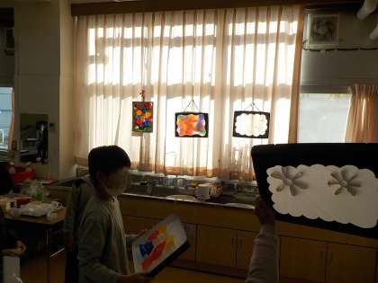 子どもたちは、自分の色セロハンを光を通して色を確かめる瞬間に「きれーい!」と嬉しそうな顔が広がりました。
