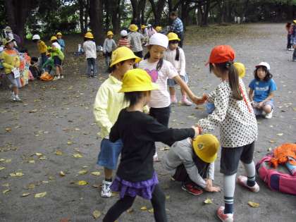 9月27日に,1・2年生の遠足で林試の森公園へ行ってきました。遠い公園まで頑張って歩いていきました。公園では,グループごとに2年生が考えた遊びを,仲良く遊びました。先週の台風で木が倒れたり,枝が折れていたりしていて遊び場が変更しましたが,おにごっこやなわとびをして元気にグループ活動をしました。