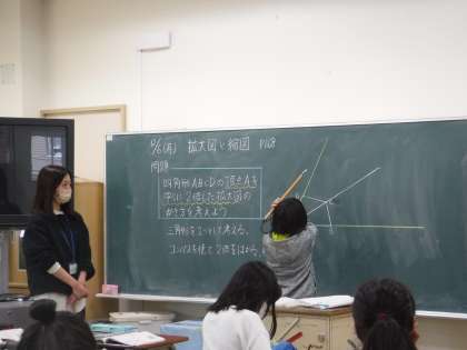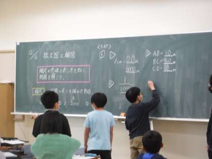 6年生の算数です。1つの点を中心にして、四角形の拡大図や縮図をかいたり(右)、縮図上の長さと実際の長さの関係を考えたり(左)しました。