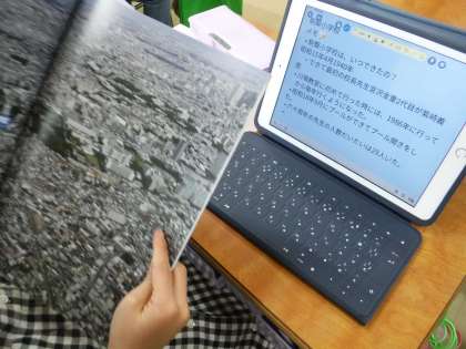 3年生の総合的な学習の時間には、駒繋小学校やその周りのものから、各自が疑問に思うことを課題として、追究していく学習を始めます。創立50周年や昨年の創立80周年の副読本も参考にしています。また、今まで、社会科で学んだ地域のことや国語で学んだ調べたことの紹介の仕方、自分の考えの伝え方も生かして学習を進めていきます。