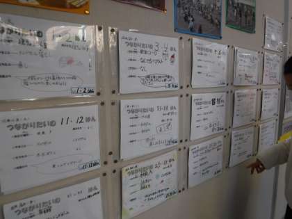 つながりタイムの計画は、班員の考えも参考にして、リーダーの6年生が決めます。職員室前の掲示板に活動内容、場所、持ち物などが貼りだされ、子どもたちはその掲示でも今日の遊びを確認できます。