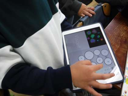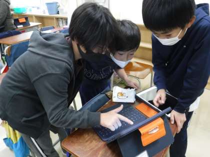 今日は、2年生が5年生にiPadを使ってできることをいろいろと教えてもらいました。プログラミングで物語を作ったり、ゲームを作ったり、きれいな模様を作ったりしました。自信をもって優しく教える5年生。できることが増えて喜ぶ2年生です。