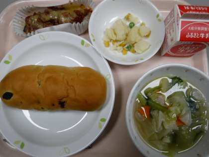 本日の献立 ぶどうパン 牛乳 魚のピザ風 コーンポテト 野菜スープ