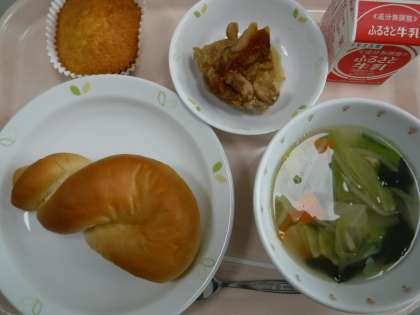 本日の献立 〜年末お楽しみ献立〜 ミルクパン 牛乳 鶏肉のマーマレードソース ベーコンと野菜のスープ パウンドケーキ