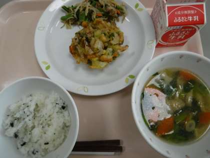 本日の献立 わかめごはん 牛乳 かきあげ 野菜のごまあえ 吉野汁