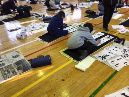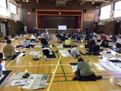 3、4時間目に学年で体育館に集まって書き初め会を行いました。冬休みの練習の成果を発揮できるようん、みんな集中して取り組んでいました。字形を整えることや字の大きさを意識して書くことができました。作品は教室前の廊下に掲示しています。