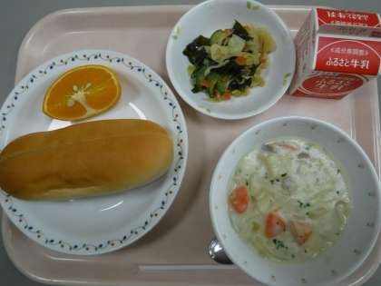 本日の献立 ジャムサンド(いちご) 牛乳 クリームシチュー わかめサラダ