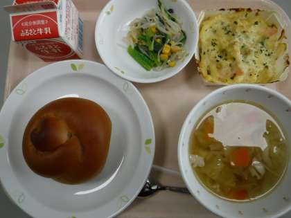 本日の献立 黒砂糖パン 牛乳 マカロニグラタン 田舎風スープ 青菜サラダ