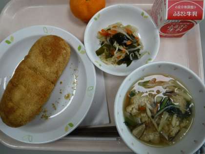 本日の献立 あげパン(きな粉) 牛乳 肉だんご入り春雨スープ 和風サラダ