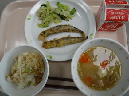 本日の献立 子ぎつねごはん 牛乳 天ぷら(ししゃも) 野菜のゆかりかけ 豚汁
