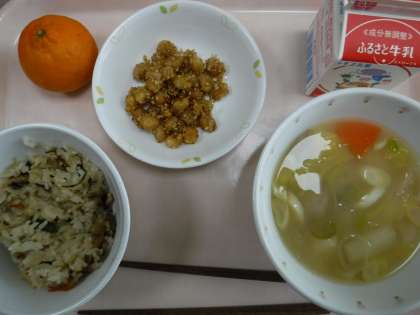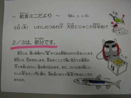 本日の献立 〜節分献立〜 磯おこわ 牛乳 いわしのつみれ汁