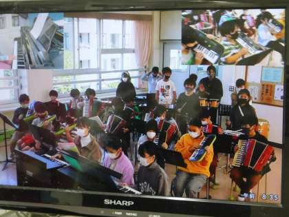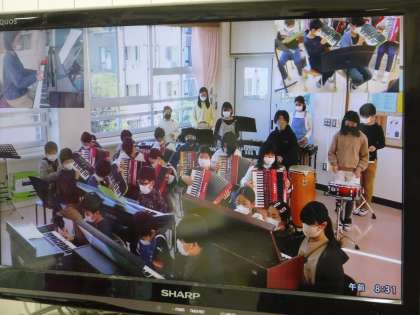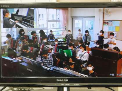 5年生が音楽の時間に取り組んできた「マンボ ナンバー5」の合奏をテレビ放送で鑑賞しました。学級ごとの発表でした。各自がめあてをもって取り組み、それぞれの良さを生かしたすてきな演奏でした。低学年の教室では、リズムに合わせて身体を動かして楽しむ姿が見られました。