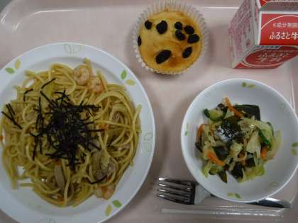 本日の献立 和風スパゲッティ 牛乳 わかめサラダ レーズンケーキ