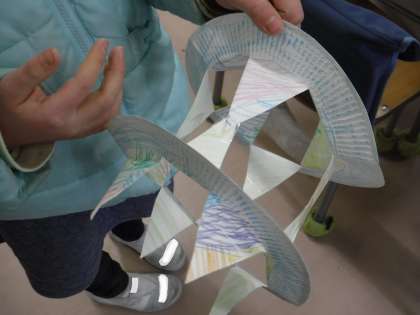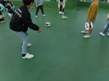 1年生が、紙皿を利用して、手本を見ながら風で回るおもちゃを作りました。よく回るための工夫をしたり、色を工夫したり、楽しんで作りました。作り終えたら屋上に上がり、転がして遊びました。教室では、自分の作った作品を写真に撮り、感想を添えて先生に提出しました。
