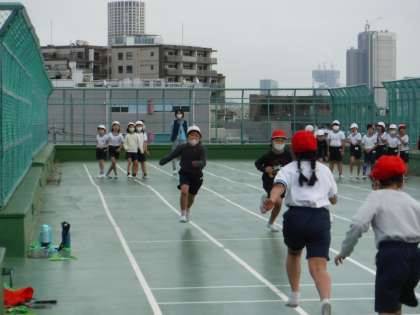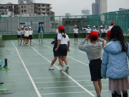 校庭の状態がよくない時間帯だったので、屋上で様々な走る運動をしました。