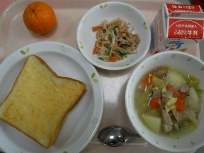 本日の献立 ガーリックトースト 牛乳 ポトフ もやしとツナのサラダ ぽんかん