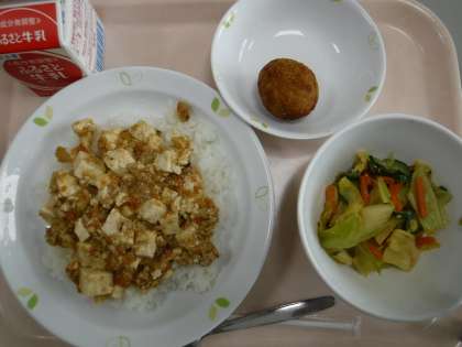 本日の献立 麻婆豆腐丼 牛乳 野菜の中華かけ さつまいものごまだんご
