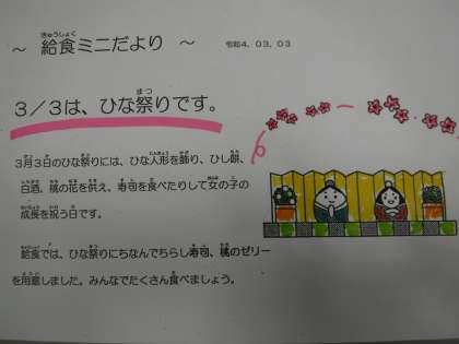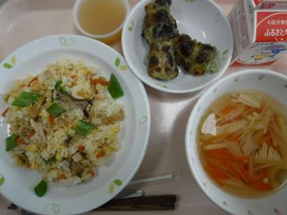 本日の献立 ちらしずし 牛乳 ちくわの磯辺揚げ 沢煮椀 もものゼリー