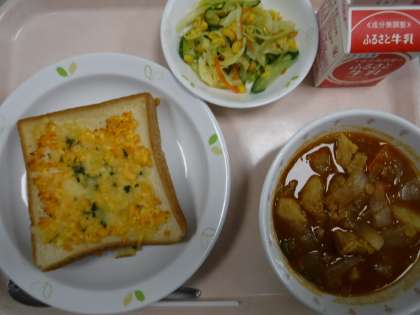 本日の献立 卵チーズトースト 牛乳 ハンガリアンシチュー