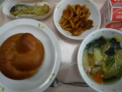本日の献立 黒砂糖パン 牛乳 魚のガーリック焼き マカロニソテー 白菜のスープ