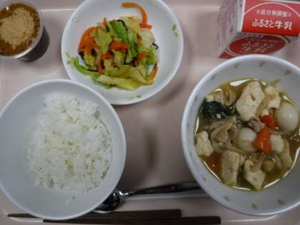 本日の献立 ごはん すきやき風 牛乳 キャベツの塩昆布かけ 黒糖寒天