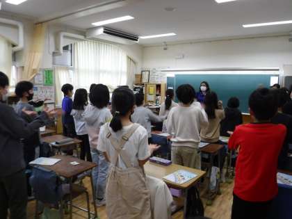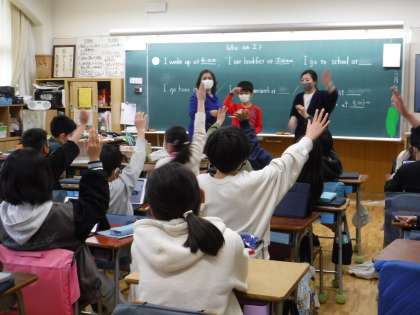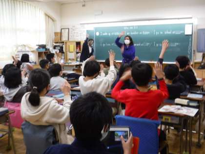 4年生の外国語活動は、ALTと担任がティームティーチングで行います。 臆せずにすすんで挙手したり、英語の表現を口にしたりして、意欲的に取り組んでいる4年生です。