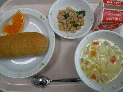 本日の献立 セサミパン 牛乳 鶏肉のクリームスープ ビーンズサラダ