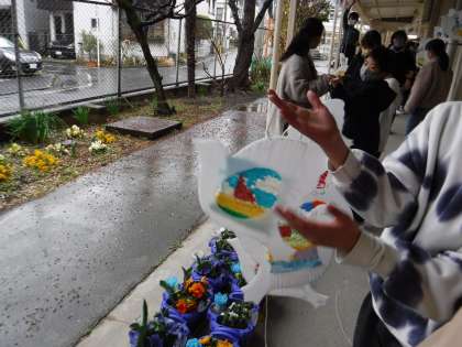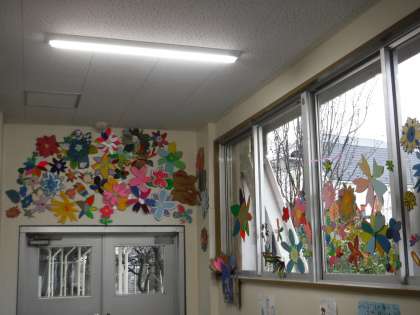 各学年が担当して、お祝いの飾りを作って、掲示しています。写真上は3年生のお花、下は5年生の鳥です。