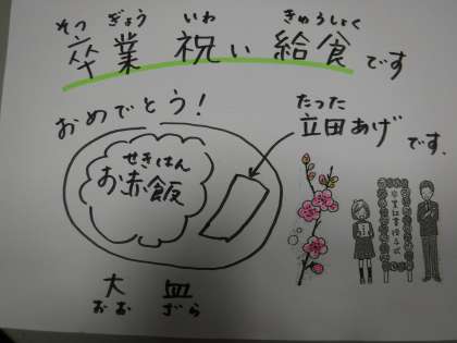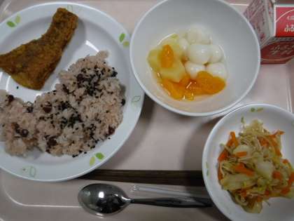 本日の献立 赤飯 牛乳 魚の立田あげ 野菜のおかかかけ フルーツ白玉