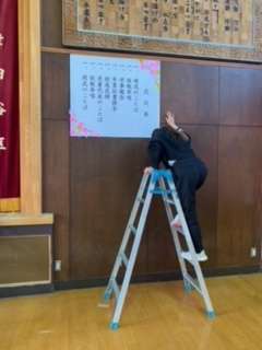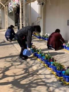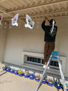 体育館の道具の移動や式場設営、清掃などは5年生が活躍して、ずいぶん前に終わっています。校内の装飾は全校児童が分担して作りました。お花は低学年が育てたパンジーです。式には参加できないけれど、全校児童が6年生の門出を祝う気持ちでいっぱいです。