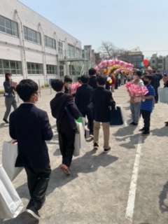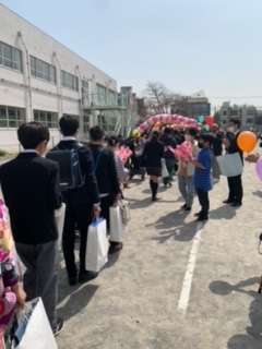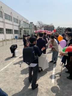 校庭でお見送りをしました。5年生の有志がたくさん集まり、花のアーチで、卒業生の門出を祝いました。