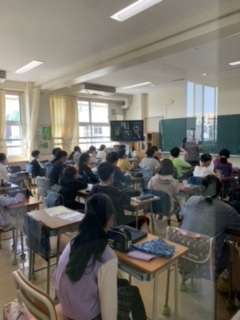 写真は1組担任が2組の子どもたちと家庭科の授業始めをしているところです。家庭科の学習が、自分たちの生活にどのように役立っているか、発表し合いました。生活に役立てている子がたくさんいました。
