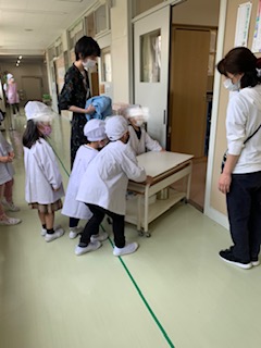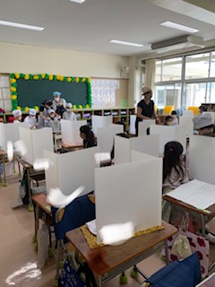 1年生の給食が始まりました。配膳の仕方、待ち方、片付け方、とてもとても上手でした。そして、美味しく給食を食べました。感染症予防のために、残念ながら黙食です。