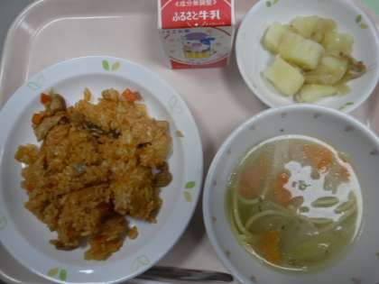 本日の献立 チキンライス 牛乳 ジャーマンポテト ヌードルスープ