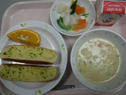 本日の献立 ガーリックトースト 牛乳 チャウダー 野菜のレモンかけ 甘夏みかん