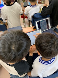 1年生は、月曜日のiPad貸与式で、クラス代表がiPadを受け取りました。今日は、一人一台iPadが貸与され、使うときのルールなども確認されました。