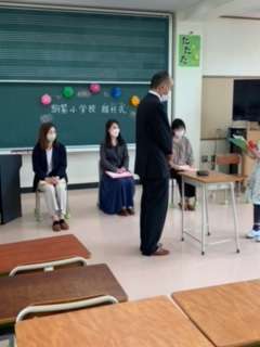 音楽室から配信の形で、離任式が行われました。代表児童がお手紙を読んで、離任される先生方に渡しました。式の後には、子どもたちによるアーチが自然につくられ、去られる先生方を見送りました。