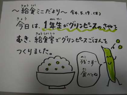 本日の献立 グリンピースごはん 牛乳 肉じゃがうま煮 大根とキャベツの甘酢かけ