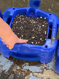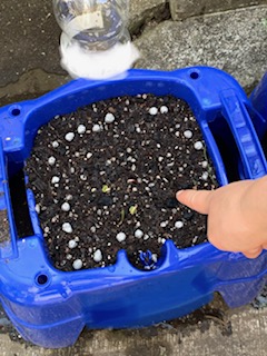 2年生に教わりながら、植木鉢にアサガオの種を蒔いた1年生。芽が出てきました。