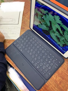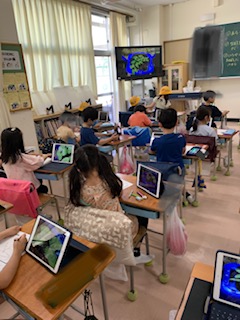 1年生は毎日あさがおのお世話をしています。すくすく育ってきました。あさがおに?名前を付けたのでしょう。「まめちゅんと言うんだ。」などと教えてくれました。写真を撮って教室でじっくり観察しました。