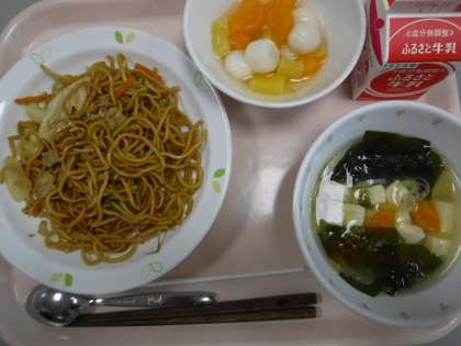 本日の献立 カレー焼きそば 牛乳 わかめスープ 白玉入りフルーツポンチ