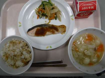 大豆とごまのごはん 牛乳 魚のバーベキューソース かみかみ野菜