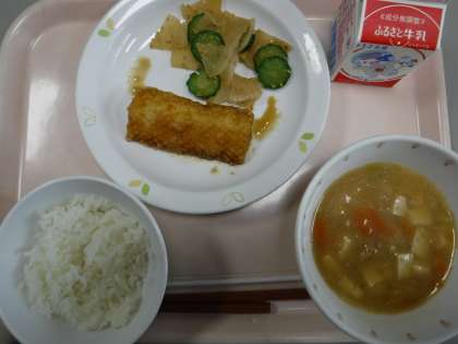 本日の献立 ごはん 牛乳 いかのかりんとあげ 麻婆汁 大根ときゅうりのごま風味