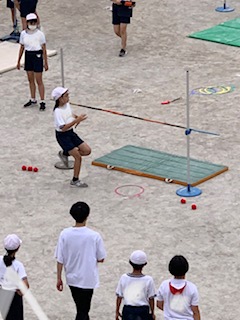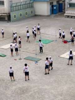 6年生の体育です。助走、踏切、空中フォームなどから自分の課題を見つけ、3人組で見合って練習を重ねています。