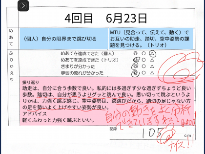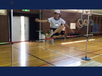 6年生の体育の学習では、「走り高跳び」を行なっています。学習をすすめるにあたって、3人組や4人組で構成されたグループでお互いの動きを見合っています。友達の動きの良いところや課題などを伝え、さらにiPadで動画を撮ってもらい自分の動きを振り返りにつなげています。前回までの自分の動きとを見比べて、上手くいったことを見つけ、高まりを実感することができています。